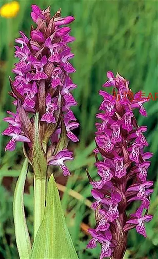 叶片卵 圆形,叶脉下凹,叶缘及叶背紫红色,10月中旬叶片呈紫红色。 6月中旬至8月底开花,花葶高40~50厘米,小花160-320朵,排 列整齐,花序直径约6厘米,紫堇色,唇瓣边缘白色;