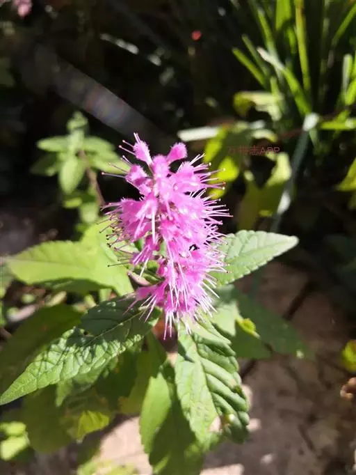 新叶紫色,10月中旬变为紫红色。6月中旬至9月开花,花葶高40-50厘米,整个花序有180-280朵小花,花序直径约为6厘米,小花 冠唇形开裂大,下唇边缘波状,柔粉色,有白色窄边,整个花序呈丰满的半球形;