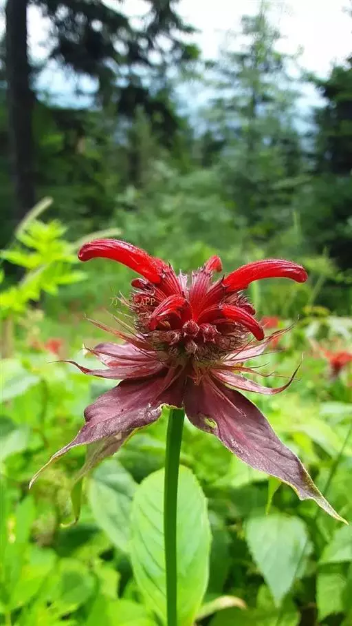 美国薄荷(学名:Monarda didymaL.):也叫马薄荷,属多年生草本植物,株高100-120厘米,茎直立,四棱形,叶质薄,对生,卵形或卵状披针形,背面有柔毛,缘有锯齿。花朵密集于茎顶,萼细长,花冠长5厘米,花簇生於茎顶,花冠管状,淡紫红色,叶芳香。轮伞花序密集多花,花筒上部稍膨大,裂片略成二唇形。花期6-9月。
