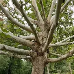 悬铃木是我国很多地区街道绿化、厂区绿化的常用树种,但绿化中参差不齐的现象普遍存在,其主要原因在于植栽时选择苗木不整齐,只求植裁成活率,忽视中后期管理(整形修剪等),使悬铃木树姿的特点未能充分体现。下面谈谈悬铃木的整形修剪: 一、在圃整形修剪 在圃整形修剪必须在苗木合理密植的基础上进行。培育杯状行道树大苗时,扦插的株行距为60×60厘米。选择速生少球悬铃木品种,当年株高可达到2.5至3.5米,待秋后或初春按“隔行去行,隔株去株,留大去小,保强去弱”的原则定苗,使留苗株行距巨基本达到1.2×1.2米。苗木第二年继续生长,冬季定干,在对高3.5至4.0处去梢,将分枝点以下主干上的侧枝剪去。第三年待苗木萌芽后,选留3至5个分支点附近分布均匀、与主干成45°左右夹角、生长粗壮的枝条作为主枝,其余分批剪去。冬季主枝留50至80厘米短截,剪口芽留在侧面,尽量使其处于同一水平面上,翌春萌发后各选留2个3级侧枝斜向生长,形成“3股6杈12枝”的造型,经以上3至4年培育的大苗胸径在7至8厘米以上,已初具杯状冠型,符合行道树标准,可出圃。 二、植栽后整形修剪 林状行道树栽植后,4至5年内应继续修剪,方法与苗期相同,直至树冠具备4至5级侧枝时为止。以后每年休眠期对当年生枝条短截,保留15至20厘米,称小回头,使萌条位置逐年提高,当枝条顶端将触及线路时,应回缩降低高度,称大回头。大小回头交替进行,使树冠维持在一定高度。 三、其他情况整形修剪 如果苗木出圃定植时未形成杯状树冠,栽植后再造型,可将定植后的苗木按理想高度定干,等萌发后留3支分布均匀、生长粗壮的枝条作为主枝,冬季短截,以后也按上述修剪方法进行。 如果道路不是很宽,上方又无电线通过,可采用开心型树冠。在栽植定干后,选留4至6根主枝,每年冬季短截后,选留1个略向斜上方生长的枝条作为主枝延长枝,使树冠逐年上升,即可形成椭圆形内膛中空的冠形。修剪时应强枝弱剪,弱枝强剪,使树冠均衡发展。另外,悬铃木除作为行道树栽植外,还可作为庭荫树、孤植树。作为庭荫树、孤植树栽植时、以自然冠形为宜。