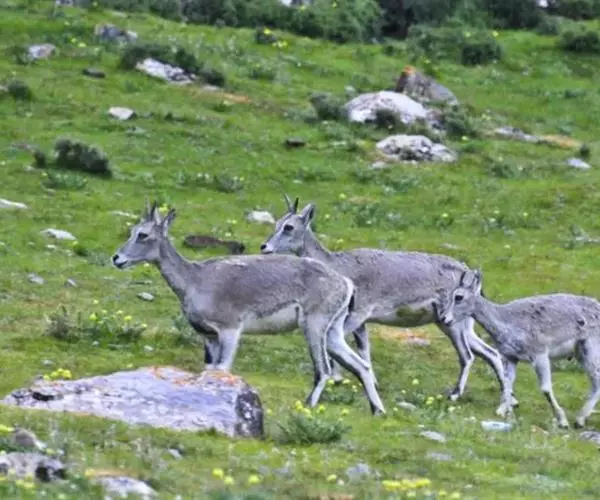 岩羊(学名:Pseudois nayaur),体型中等,形态介于野山羊与野绵羊之间。两性具角,雄羊角粗大似牛角,但仅微向下后上方弯曲。以青草和各种灌丛枝叶为食。冬季啃食枯草。它们还常到固定的地点饮水,但到寒冷季节也可舔食冰雪。无固定兽径和栖息场所。它们在悬崖峭壁只要有一脚之棱,便能攀登上去。一跳可达2、3米,若从高处向下更能纵身一跃10多米而不致摔伤。冬季发情交配,次年6、7月产仔,每年通常只产1仔。主要天敌是雪豹、豺、狼,以及秃鹫和金雕等大型猛禽。中国国家二级重点保护野生动物。