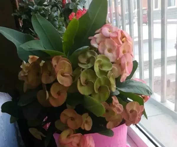 越冬期间室温低时叶子完全脱落,进入半休眠状态,此时要严格控制浇水,保持盆土干燥。温度低于0℃时植株会因冻害死亡。冬季室温如能保持在15℃以上则整个冬季开花不断。虎刺梅是很适合北方栽植的秋、冬季室内花卉。
