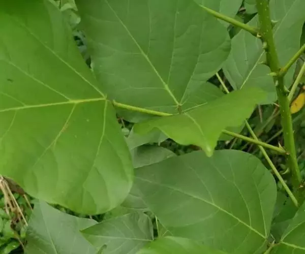 刺桐是落叶大乔木,高可达20米。树皮灰褐色,枝有明显叶痕及短圆锥形的黑 刺桐 色直刺,髓部疏松,颓废部分成空腔。羽状复叶具3小叶,常密集枝端;托叶披针形,早落;叶柄长10-15厘米,通常无刺;小叶膜质,宽卵形或菱状卵形,长宽15-30厘米,先端渐尖而钝,基部宽楔形或截形;基脉3条,侧脉5对;小叶柄基部有一对腺体状的托叶。