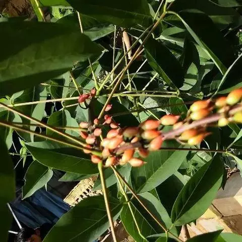 荚果肿胀黑色,肥厚,种子间略缢缩,长15-30厘米,宽2-3 刺桐 厘米,稍弯曲,先端不育;种子1-8颗,肾形,长约1.5厘米,宽约1厘米,暗红色。花期3月,果期8月。
