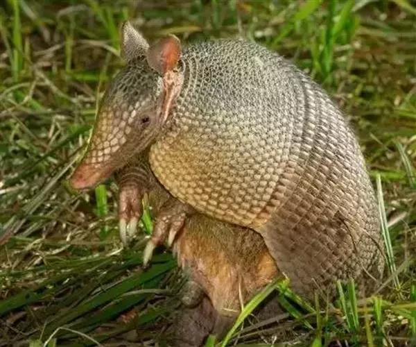 小犰狳身体的上表面,大部分的头部和尾巴,包括灵活的皮肤覆盖着 小犰狳2 一层盔甲骨板和坚硬的角质皮肤。小犰狳保护鳞甲的甲壳边缘是独特的锯齿状的。除了白线的中间,和沿横向边缘和尾巴、腹部偏黄,壳的颜色通常是深褐色。 在它的背部柔软皮肤上覆盖着粗黄色的鬃毛。 强大而又成熟的爪子使得小犰狳的四肢更具力量。 与其他犰狳物种相比,小犰狳的耳朵很小。