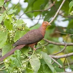斑尾鹃鸠体长38厘米,是体大而尾长的褐色鹃鸠。背及尾满布黑色或褐色横斑。头灰,颈背呈亮蓝绿色。胸偏粉,…