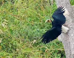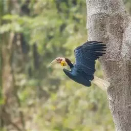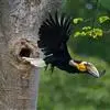 马来犀鸟经常集小群一起鸣唱,在大公顷的森林中寻找食物。在群体中,夫妻只在繁殖季节呆在一起,在繁殖季节,无论雌雄都有强烈的领地意识,强大的呼叫声听起来像鼓吹证明它们的存在。以成熟的果实,昆虫,小蜥蜴,甚至小鸟为食,犀鸟经常跟随成群的猴子,以便找到成熟的果实,在它们的食物来源中,动物食材占30%左右。
