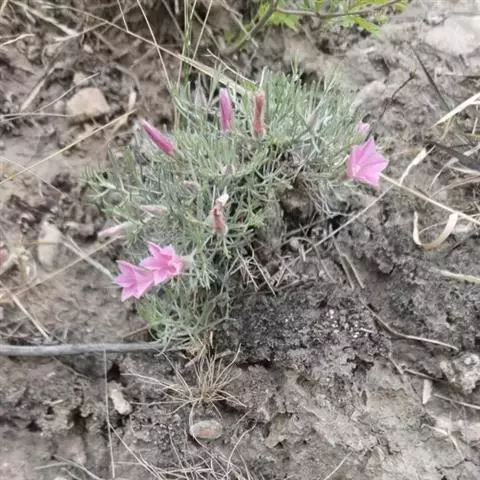 多年生草本,根状茎短,木质化,茎少数或多数,高2~10(~15)厘米,平卧或上升,枝和叶密被贴生稀半贴生银灰色绢毛。叶互生,线形或狭披针形,长1~2厘米,宽(0.5~)1~4(5)毫米,先端锐尖,基部狭,无柄。花单生枝端,具细花梗,长0.5~7厘米;萼片5,长(3-5~)4~7毫米,外萼片长圆形或长圆状椭圆形,近锐尖或稍渐尖,内萼片较宽,椭圆形,渐尖,密被贴生银色毛;花冠小,漏斗状,长(8)~9~15毫米,淡玫瑰色或白色带紫色条纹,有毛,5浅裂;雄蕊5,较花冠短一半,基部稍扩大;雌蕊无毛,较雄蕊稍长,子房2室,每室2胚珠;花柱2裂,柱头2,线形。蒴果球形,2裂,长约4~5毫米。种子2~3枚,卵圆形,光滑,具喙,淡褐红色。