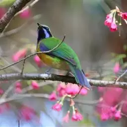橙腹叶鹎体形大小和金额叶鹎相似,体长16~20厘米。额至后颈黄绿色,其余上体绿色,小覆羽亮钴蓝色,…