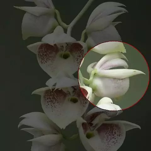 花葶连同幼嫩的假鳞茎和叶从靠近老假鳞茎基部的根状茎上发出,长12—14厘米,初时大部分为鞘所包,仅伸出花序;总状花序长4—6厘米,通常具2朵花;花苞片长圆状披针形,膜质,多少呈舟状,长2—2.5厘米,常围抱花梗与子房;花梗与子房与花苞片近等长;
