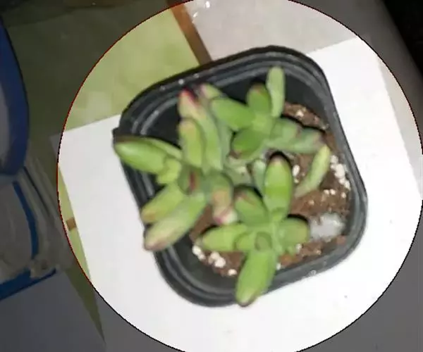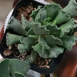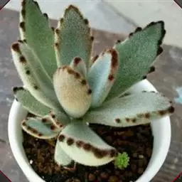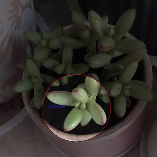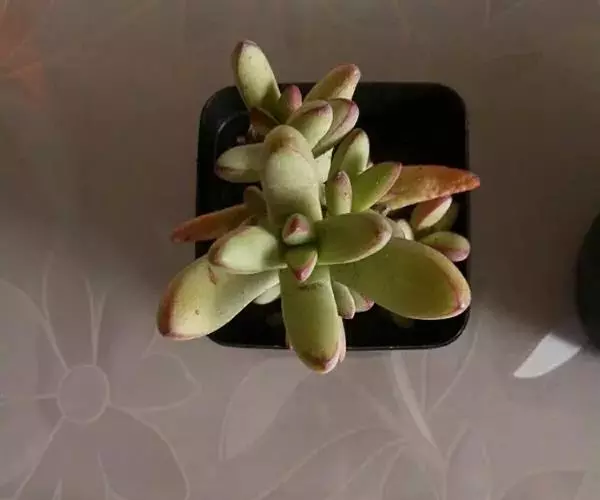 小天狗叶片半橄榄型,叶片颜色绿,叶片上密布小斑点,叶缘至叶片的顶端微褐红色,在晚秋和早春,温差大的时候红褐色尤为明显。开花为白色,每年的9月至第二年的6月为植株的生长期(环境不一样,生长期也有长短),若光照不足会使植株徒长,叶与叶之间的上下距离拉长,使得株型松散,茎变的很脆弱,叶缘的红褐色也会减退变绿;而在阳光充足之处生长的植株,株型矮壮,茎节之间排列会紧凑。