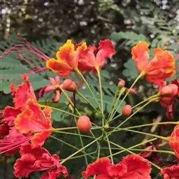 洋金凤 Sw.),豆科小凤花属灌木状或小乔木植物,枝无毛,绿或粉绿色;二回羽状复叶;总状花序伞房状,…
