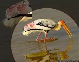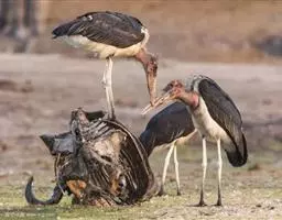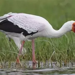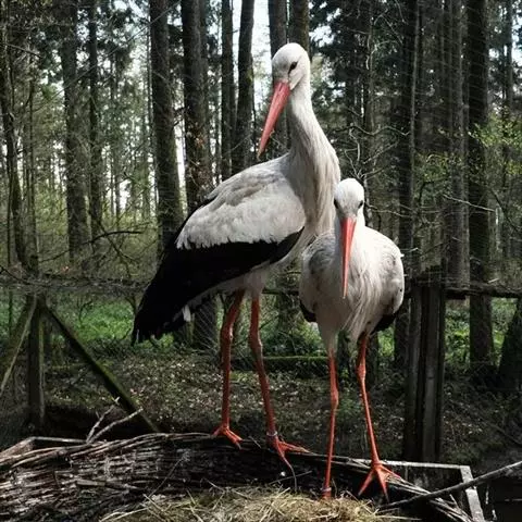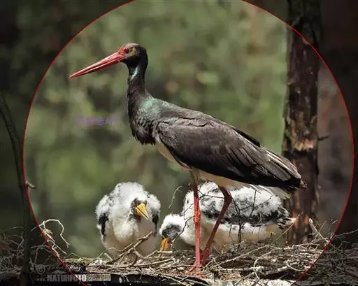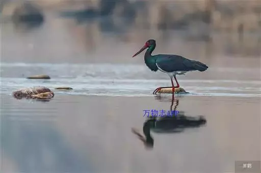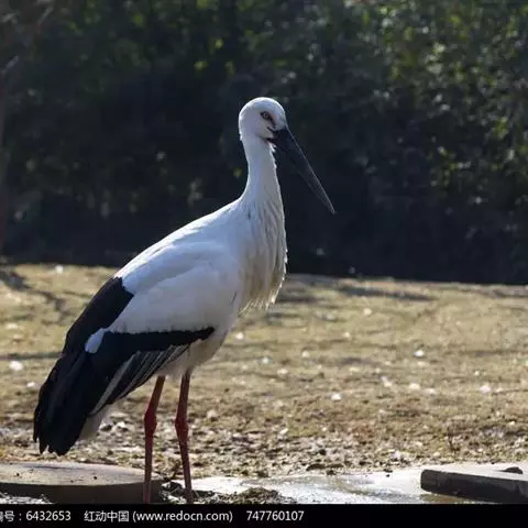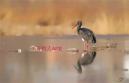 黑鹳,又叫“乌鹳”、“锅鹳”。它体长约1米,上体羽毛为黑色,并带有紫绿色的金属光泽,胸下部及腹部羽毛为白色,嘴、腿均为红色。黑鹳在我国分布较广,种群数量要比白鹳多。夏季在北方各省都可见到黑鹳,冬天它们则去南方越冬。黑鹳喜欢结群,常常在沼泽和湿地间觅食,以鱼、蛙、甲壳动物等为主要食物,年产卵2-6个,呈白色。在东北、华北一带的黑鹳,常筑巢于山区的岩隙悬崖间,而新疆的黑鹳则在塔里木河流域的胡杨树上营巢。
