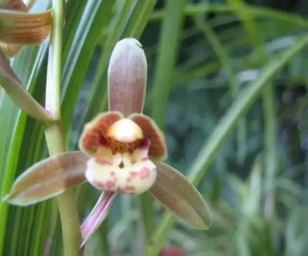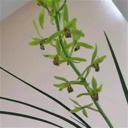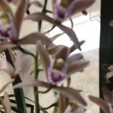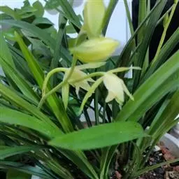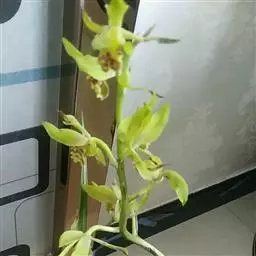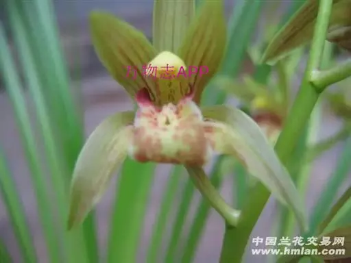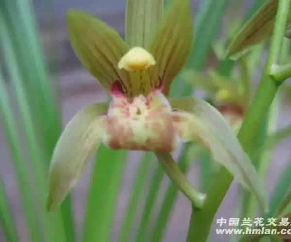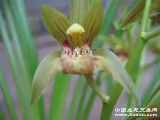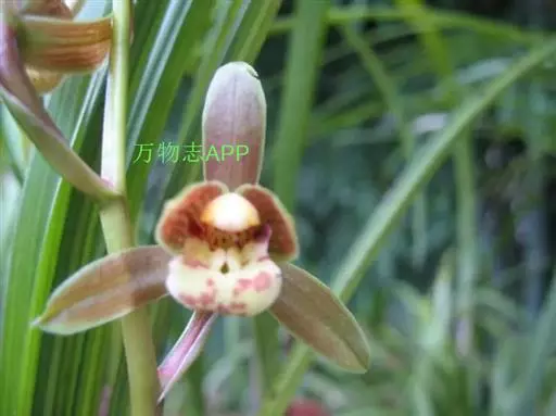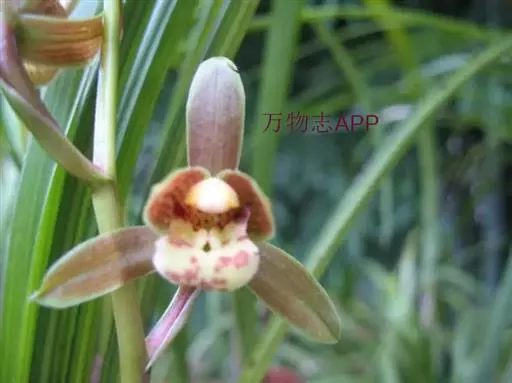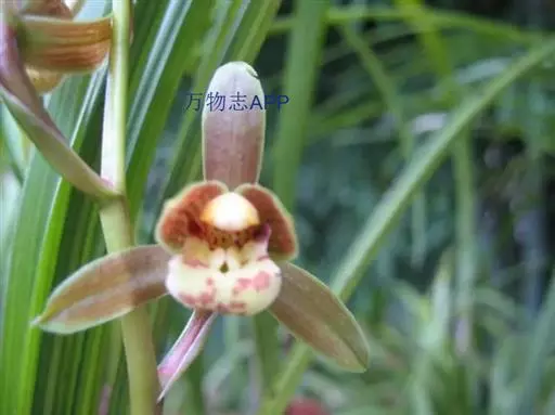 花葶从假鳞茎基部发出,直立,长20-40厘米;总状花序具3-7朵花;花苞片近披针形,长1.4-4.1厘米,在花序上部的亦超过花梗和子房长度的1/2;花梗和子房长1.5-2.5厘米;花与寒兰颇相似,有柠檬香气;萼片与花瓣黄绿色或苹果绿色,偶见淡黄色或草黄色,唇瓣色淡或有时带白色或淡黄色,侧裂片上有紫纹,中裂片上有紫色斑;萼片线形至宽线形,长1.8-3.5厘米,宽4-7毫米。