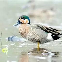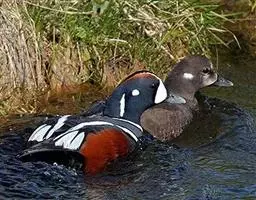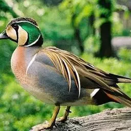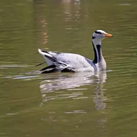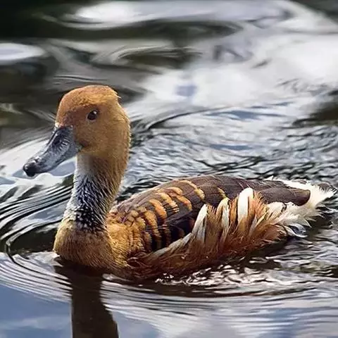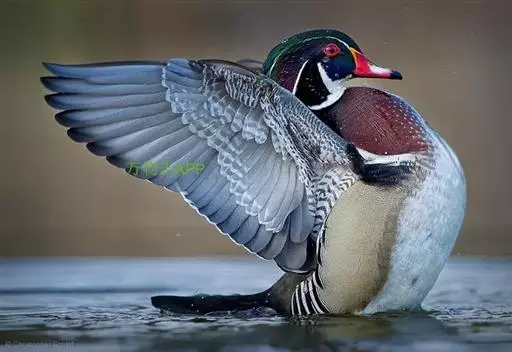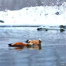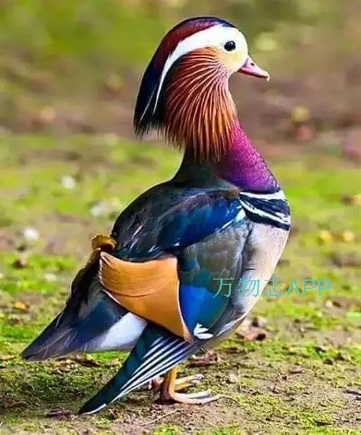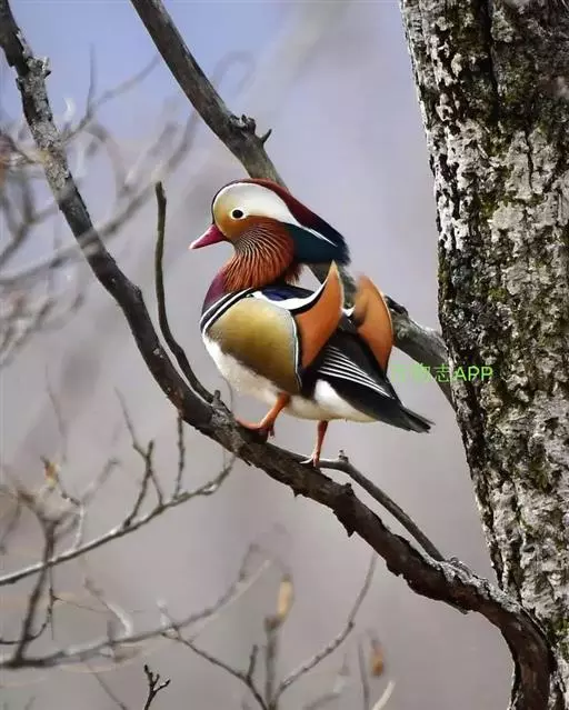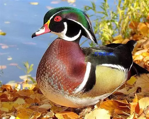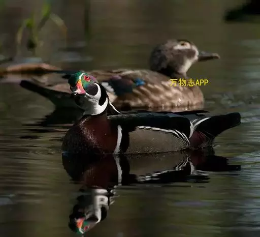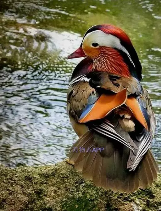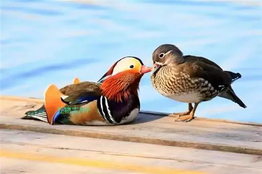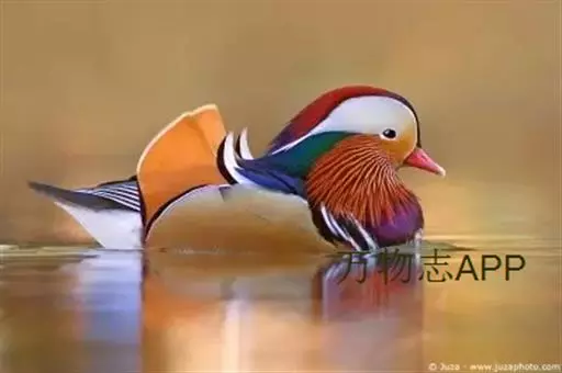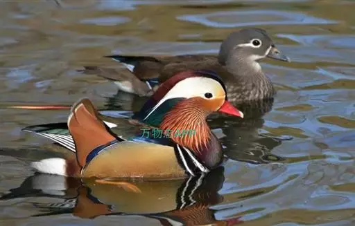 鸳鸯(学名:Aix galericulata):鸳指雄鸟,鸯指雌鸟,故鸳鸯属合成词。属雁形目的中型鸭类,大小介于绿头鸭和绿翅鸭之间,体长38-45厘米,体重0.5千克左右。雌雄异色,雄鸟嘴红色,脚橙黄色,羽色鲜艳而华丽,头具艳丽的冠羽,眼后有宽阔的白色眉纹,翅上有一对栗黄色扇状直立羽,像帆一样立于后背,非常奇特和醒目,野外极易辨认。雌鸟嘴黑色,脚橙黄色,头和整个上体灰褐色,眼周白色,其后连一细的白色眉纹,亦极为醒目和独特。
