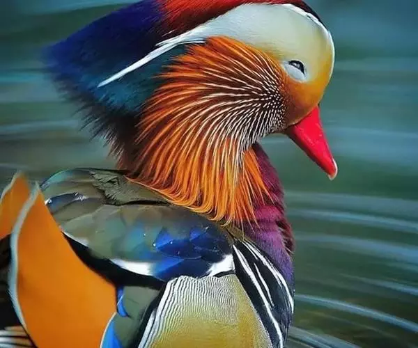 鸳鸯是小型游禽,雄鸟额和头顶中央翠绿色,并具金属光泽;枕部铜赤色,与后颈的暗紫绿色长羽组成羽冠。眉纹白色,宽而且长,并向后延伸构成羽冠的一部分。眼先淡黄色,颊部具棕栗色斑,眼上方和耳羽棕白色,颈侧具长矛形的辉栗色领羽。背、腰暗褐色,并具铜绿色金属光泽;内侧肩羽紫色,外侧数枚纯白色,并具绒黑色边;翅上覆羽与背同色。初级飞羽暗褐色,外翈具银白色羽缘,内翈先端具铜绿色光泽;次级飞羽褐色,具白色羽端,内侧数枚外翈呈金属绿色;三级飞羽黑褐色,外翈亦呈金属绿色,与内侧次级飞羽外翈上的绿色共同组成蓝绿色翼镜,最后一枚三级飞羽外翈为金属绿色,具栗黄色先端,而内翈则扩大成扇状,直立如帆,栗黄色,边缘前段为棕白色,后段为绒黑色,羽干黄色。尾羽暗褐色而带金属绿色。颏、喉纯栗色。上胸和胸侧暗紫色,下胸至尾下覆羽乳白色,下胸两侧绒黑色,具两条白色斜带,两胁近腰处具黑白相间的横斑,其后两胁为紫赭色,腋羽褐色。