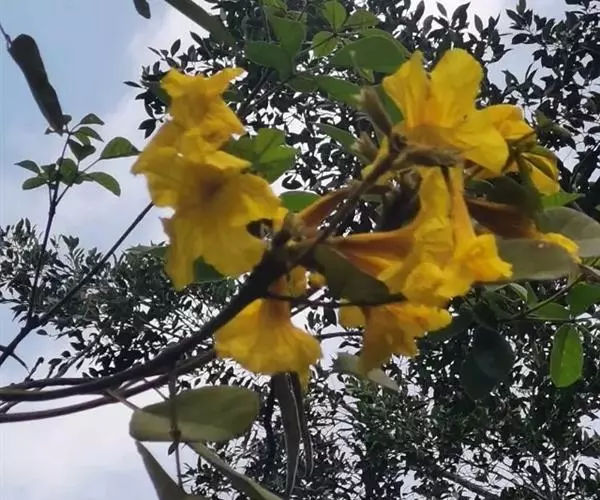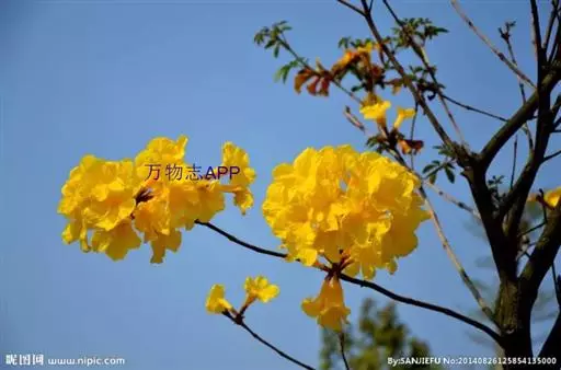 黄钟木别名黄花风铃木,树高约5米;掌状复叶,小叶3-5枚,叶片被褐色细茸毛;花集生于枝端,花冠漏斗形,鲜黄色;果实圆柱形,下垂,被褐色茸毛,形如可爱的小猫尾巴。先花后叶,春季绽放风铃般的花朵挂满枝头,花团锦簇,形成一片金黄色的花海,极为壮观,可做行道树、庭院树。