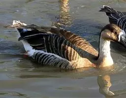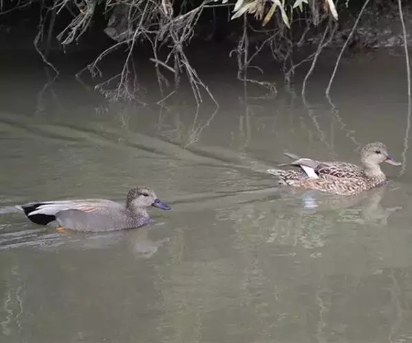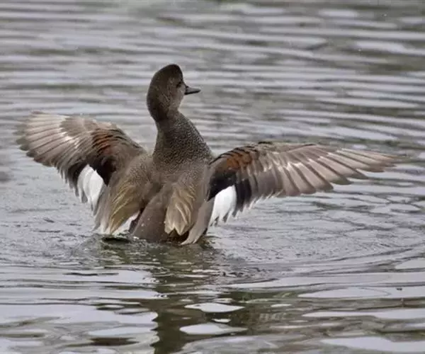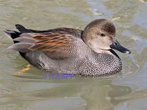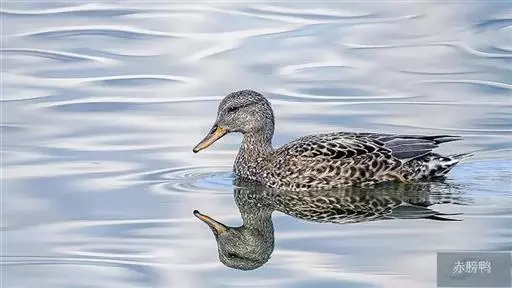 赤膀鸭(学名:Anas strepera)中型鸭类,个体较家鸭稍小,体长44-55厘米,体重0.7-1千克。雄鸟嘴黑色,脚橙黄色。上体暗褐色,背上部具白色波状细纹,腹白色,胸暗褐色而具新月形白斑,翅具宽阔的棕栗色横带和黑白二色翼镜,飞翔时尤为明显。雌鸟嘴橙黄色,嘴峰黑色。上体暗褐色而具白色斑纹,翼镜白色。以水生植物为主。常在水边水草丛中觅食。觅食时常将头沉入水中,有时也头朝下,尾朝上倒栽在水中取食。繁殖于冰岛、英国东南部,往东横跨欧洲、亚洲一直到堪察加半岛,往南到荷兰、德国、俄罗斯中部、里海、中亚、加拿大和美国;越冬在欧洲南部、中国南部、日本、越南、印度、北非和北美南部和太平洋中的范宁岛。