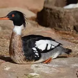 红胸秋沙鸭属中等食鱼鸭类,体长53厘米。嘴细长而带钩,捕食鱼类。丝质冠羽长而尖。雄鸟黑白色,两侧多…