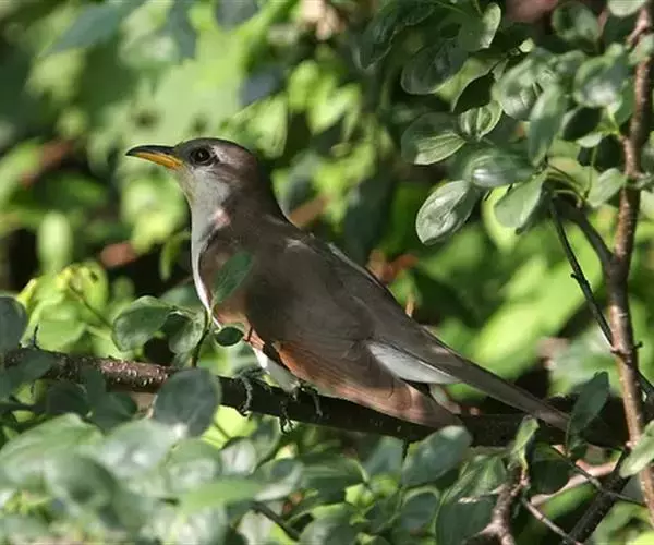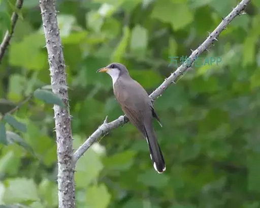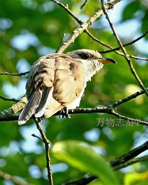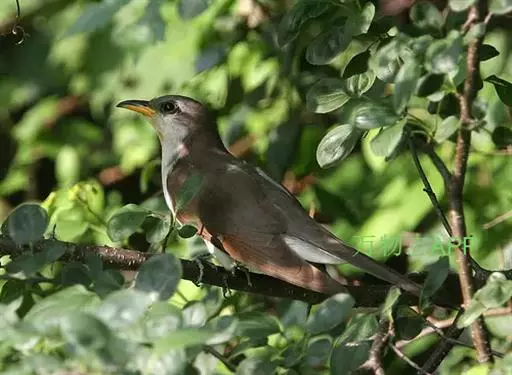 黄嘴杜鹃(Coccyzus americanus):成鸟体长26-30厘米,体重55-56克。有一条长长的尾巴,上面是棕色,下面是黑色和白色相间,下颌至鸟喙有带黄色的一个黑色弧形。主要以昆虫为食,尤其喜吃鳞翅目幼虫,如松毛虫,树粉蝶幼虫、蛾类等,有时也吃植物种子等少量植物性食物。