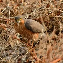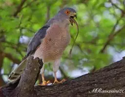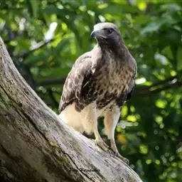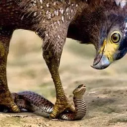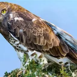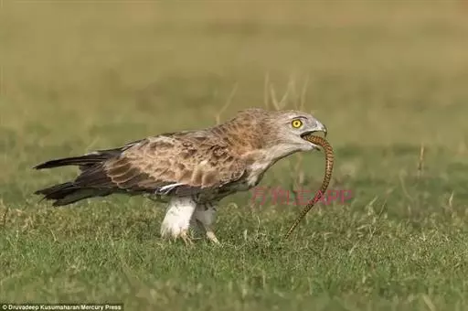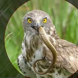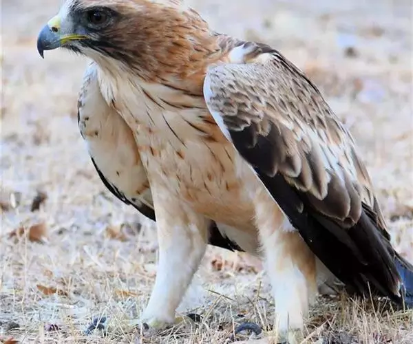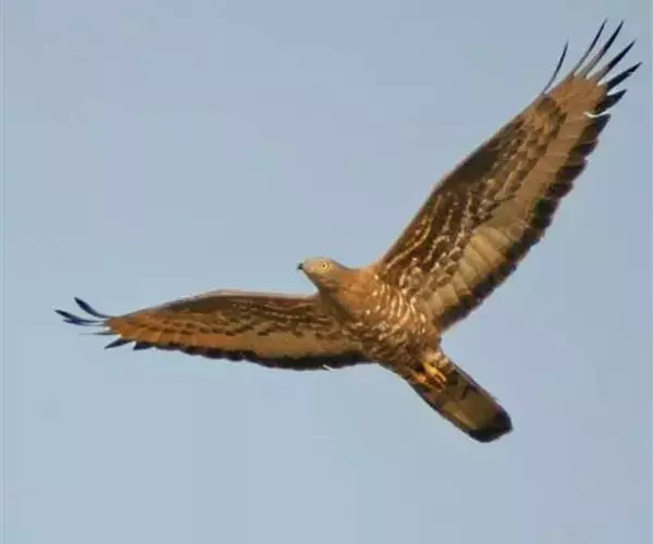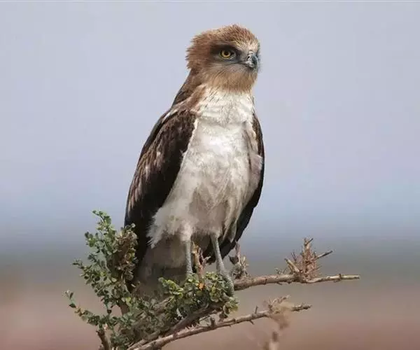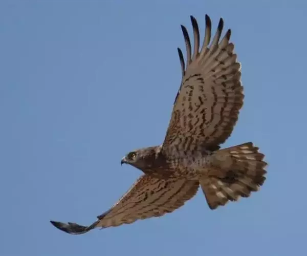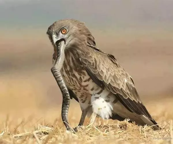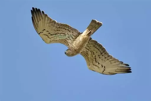 短趾雕(学名:Circaetus gallicus):体长62-70厘米,体重1.2 - 2.3千克。它们的颔、颈和胸部上方呈浅棕色。头部浑圆像猫头鹰般,眼睛呈鲜黄色。身体沉重,上体灰褐,下体白而具深色纵纹,喉及胸单一褐色,腹部具不明显的横斑,尾具不明显的宽阔横斑。虹膜黄色;嘴黑色;蜡膜灰色;脚偏绿。