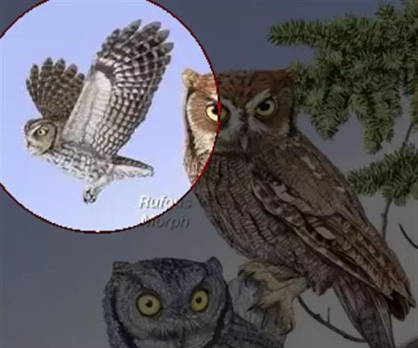 上体沙褐色或灰褐色,头较圆,眼较大,头顶后颈和上背具较长的披针形羽毛和黑褐色羽轴纹,眼先、额、颊、眉纹和眼下白色。最长的肩羽暗褐色,尾灰褐色,具白色尖端和3道黑色横斑,其中亚端黑色横斑最宽。内侧次覆羽淡灰褐色,内翈基部白色,外侧次覆羽暗褐色;初级飞羽黑褐色,内翈基部白色,次级飞羽内翈羽缘白色,具不清晰的黑色横斑。颏、喉和上胸土褐色,具黑色羽轴纹的白色羽基,其余下体白色,具淡褐色横斑,有时腹中部无横斑或横斑不明显。雄雕和雌雕外观相似,但雌雕更重,尾巴稍长。