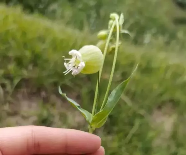 多年生草本,高40-90余厘米,全株无毛,呈灰绿色。根多数,略呈细纺锤形。茎直立,丛生,上部分枝,节 狗筋麦瓶草 部膨大。叶披针形至卵伏披针形,长5-8厘米,宽1-2.5厘米,茎下部叶基部渐狭成短柄,先端急尖或渐尖,边缘具刺状微齿,中脉明显,茎上部叶无柄,基部抱茎,边缘平滑。花顶生,形成较稀疏的大形聚伞花序;花梗下垂,与萼等长或比萼短;萼筒广卵形,膜质,膨大成囊泡状,无毛,长14-16毫米,宽7-10毫米,具20条脉,脉间由多数网伏细脉相连,常带紫堇色,萼齿三角形,先端急尖,边缘具白色微毛;雌雄蕊柄长约2毫米,无毛;花瓣白色,平展,约比萼长出半倍,长15-17毫米,瓣片2深裂几达基部,爪上部宽,基部渐狭,瓣片及爪部之间无鳞片状附属物;雄蕊超出花冠;子房卵形,长约3毫米,花柱3枚,超出花冠。蒴果略呈球形,径约8毫米,平滑有光泽,6齿裂;种子肾形,成熟时黑褐色,长约1.5毫米,宽1.2毫米,表面被乳头伏突起。