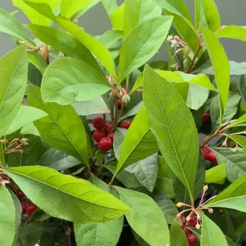小灌木或亚灌木,近蔓生,具匍匐生根的根茎;直立茎长达30厘米,稀达40厘米,不分枝,幼时被细微柔毛,以后无毛。叶对生或近轮生,叶片坚纸质或近革质,椭圆形至椭圆状倒卵形,顶端急尖,基部楔形,长4-7厘米,宽1.5-4厘米,边缘具细锯齿,多少具腺点,两面无毛或有时背面仅中脉被细微柔毛,侧脉5-8对,细脉网状;叶柄长6-10毫米,被微柔毛。亚伞形花序,腋生或生于近茎顶端的叶腋,总梗长约5毫米,有花3-5朵;花梗长7-10毫米,常下弯,二者均被微柔毛;花长4-5毫米,有时6数,花萼基部连合,萼片卵形,顶端急尖或钝,长约1.5毫米或略短,两面无毛,具缘毛,有时具腺点;花瓣粉红色或白色,广卵形,长4-5毫米,无毛,具密腺点;雄蕊较花瓣略短,花药披针状卵形或卵形,背部具腺点;雌蕊与花瓣等长,子房卵珠形,无毛;胚珠15枚,3轮。果球形,直径5-6毫米,鲜红色转黑色,多少具腺点。花期5-6月,果期11-12月,有时5-6月仍有果。