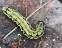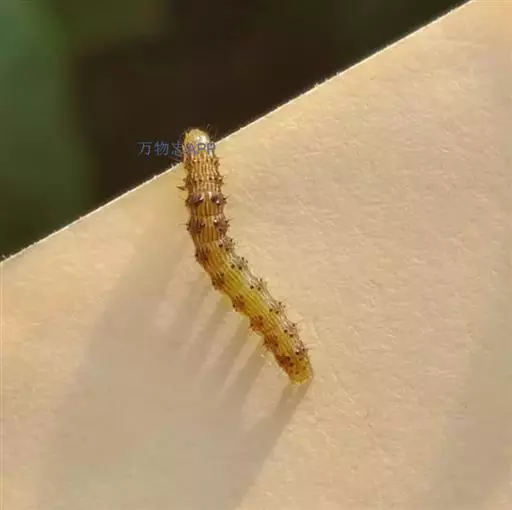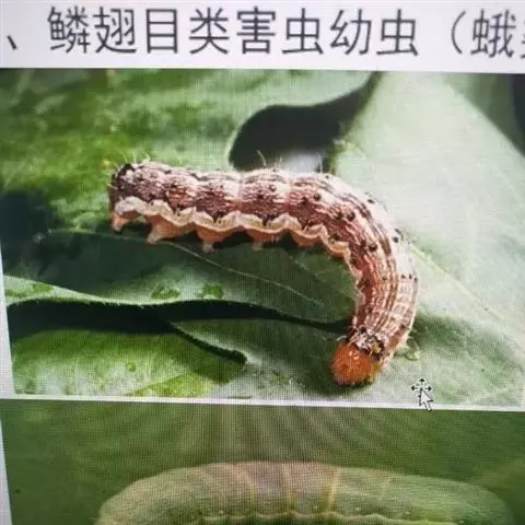 幼虫:老熟幼虫长约40~50mm,初孵幼虫青灰色,以后体色多变,分4个类型:1)体色淡红,背线,亚背线褐色,气门线白色,毛突黑色。2)体色黄白,背线,亚背线淡绿,气门线白色,毛突与体色相同。3)体色淡绿,背线,亚背线不明显,气门线白色,毛突与体色相同。4)体色深绿,背线,亚背线不太明显,气门淡黄色。头部黄色,有褐色网状斑纹。虫体各体节有毛片12个,前胸侧毛组的L1毛和L2毛的连线通过气门,或至少与气门下缘相切(区别于烟夜蛾)。体表密生长而尖的小刺。