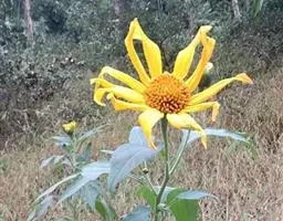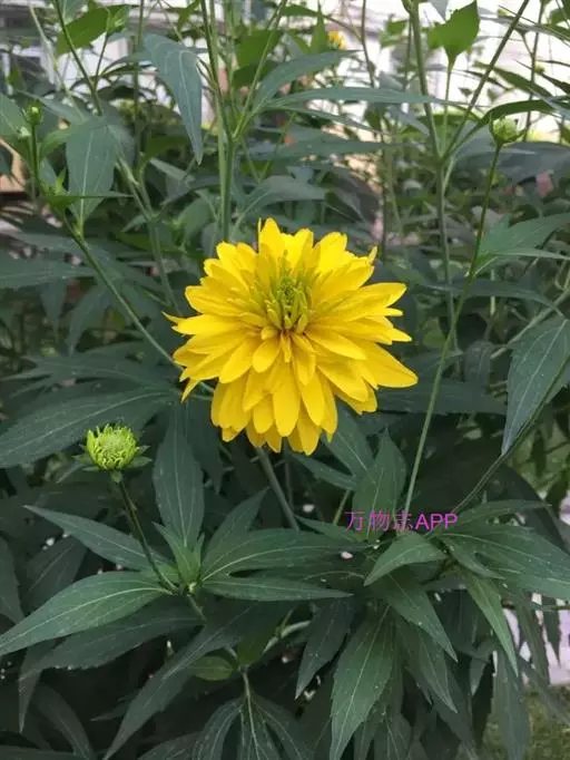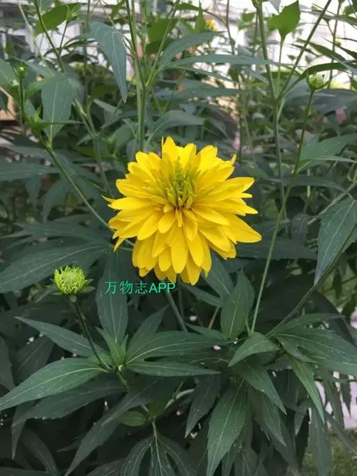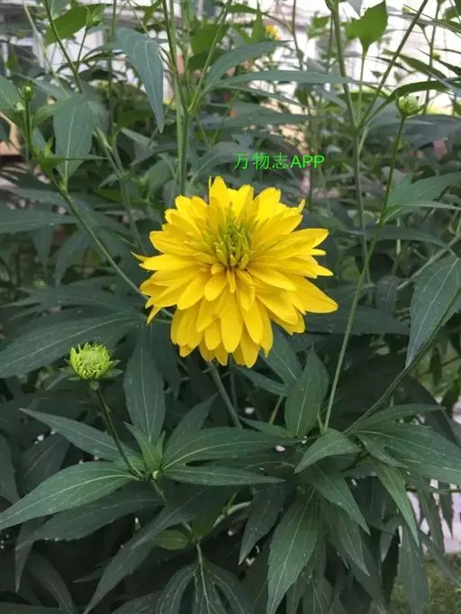 多年生草本,高60~180厘米。茎分枝;上部叶片阔披针形,叶较宽,基生叶羽状5~7裂;茎生叶3~5裂,边缘具稀锯齿。头状花序具长柄,花径10~20厘米,黄色,重瓣,花期6—8月。