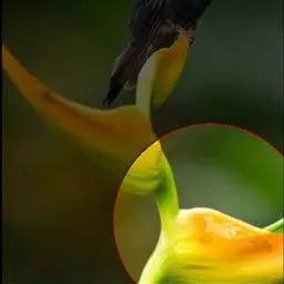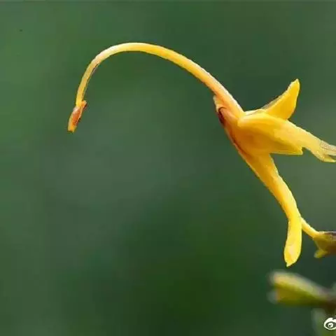 株高30-50厘米。叶片5-6枚,椭圆状披针形,长15-20厘米,宽3-4.5厘米,无毛,顶端尾状渐尖,基部钝;叶柄长约5毫米;叶舌短。圆锥花序长5-11厘米,下垂,上部有分枝,分枝长1-2.5厘米,疏离,有2-多花,下部无分枝,而在苞片内仅有珠芽;苞片披针形,长6-12毫米;珠芽卵形,表面疣状,直径2-4毫米。花黄色,小花梗极短;萼钟状,长4-5毫米,具3齿;花冠管长8-10毫米,被短柔毛,裂片卵形;侧生退化雄蕊披针形,镰状弯曲;唇瓣狭楔形,黄色,顶端2裂,基部具橙红色的斑点;花丝长1厘米,弯曲,花药每边有2个三角形、翅状附属体;子房具疣点。花期:8-9月。