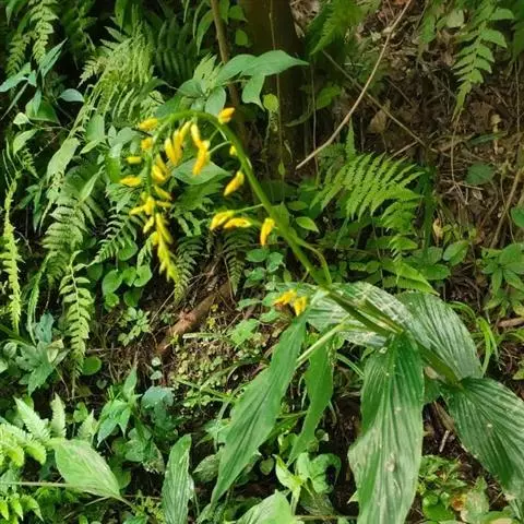 直立草本,高30—50厘米。叶片长圆状披针形,长15—20厘米,宽3—4.5厘米,先端尾状渐尖,基部钝,两面无毛;叶柄长约5毫米;叶舌短。顶生圆锥花序,长5—11厘米,下垂,上部有分枝,具2朵以上发育正常的花,下部无分枝,苞片内仅有珠芽;苞片披针形,长6—12毫米;珠芽卵形,表面具疣状凸起。花黄色,小花梗极短;花萼钟状,长4—6毫米,先端具3齿;花冠管长8—10毫米,被短柔毛,裂片卵形;侧生退化雄蕊披针形,镰状弯曲;唇瓣狭楔形,黄色,先端2裂,基部具橙红色的斑点;花丝长约1厘米,弯曲,花药两边各具2枚三角状附属体;子房具疣点。花期8—9月,果期9—11月。