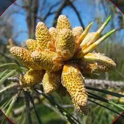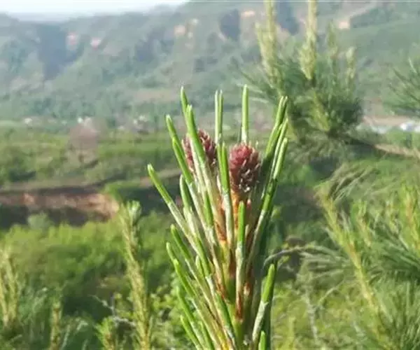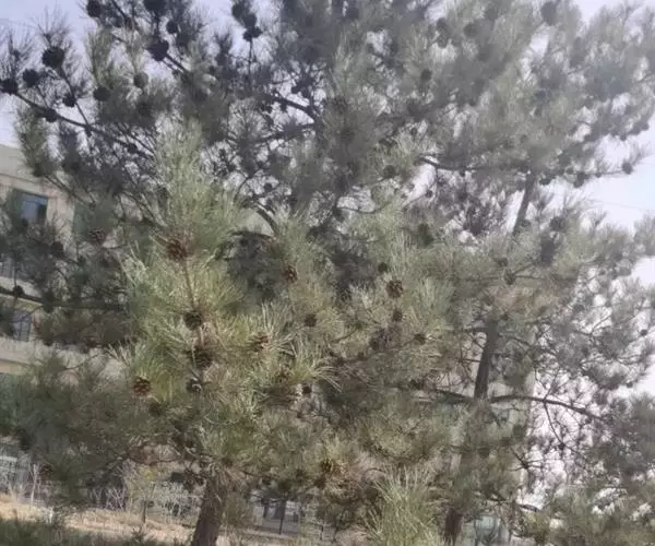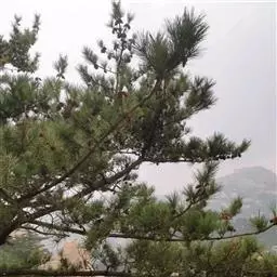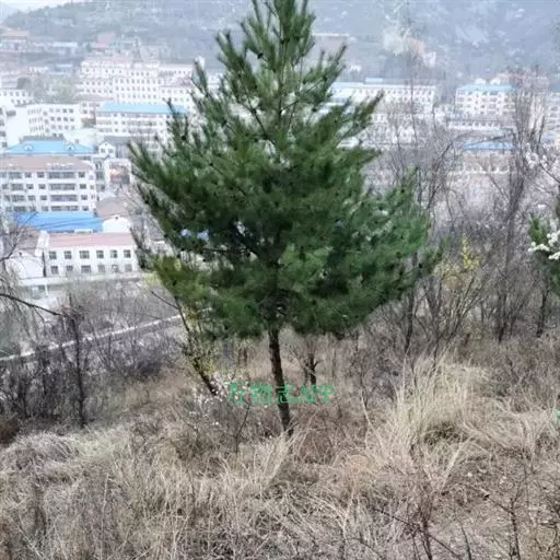 油松(学名:Pinus tabuliformis Carr.) :为松科针叶常绿乔木,高达30米,胸径可达1米。树皮下部灰褐色,裂成不规则鳞块。大枝平展或斜向上,老树平顶;小枝粗壮,雄球花柱形,长1.2-1.8厘米,聚生于新枝下部呈穗状;球果卵形或卵圆形,长4-7厘米。种子长6-8毫米,连翅长1.5-2.0厘米、翅为种子长的2-3倍。花期5月,球果第二年10月上、中旬成熟。