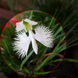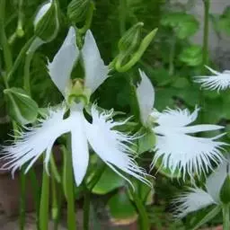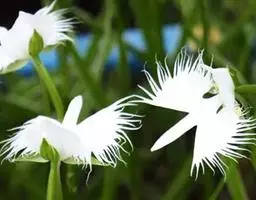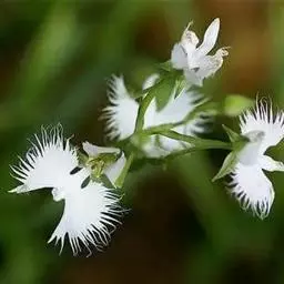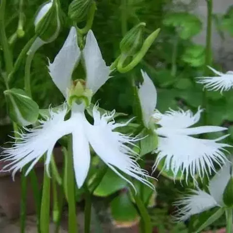植株高25-60厘米。块茎肉质,长椭圆形或长圆形,长3-5厘米,直径1.5-2.5厘米。茎粗,直立,圆柱形,近中部具5-6枚叶,向上有5-10枚疏生的苞片状小叶。叶片椭圆状披针形、倒卵状匙形或长椭圆形,长5-16厘米,宽2-5厘米,先端渐尖或急尖,基部收狭抱茎。总状花序具6-15朵花,长9-23厘米,花葶具棱,棱上具长柔毛;花苞片卵形,长13-15毫米,先端渐尖,边缘具缘毛,较子房短;子房圆柱状纺锤形,扭转,具棱,棱上有细齿,连花梗长23-25毫米,先端弯曲,具喙;花白色或绿白色,罕带粉色,中等大;中萼片宽卵形,凹陷,兜状,长6-9毫米,宽5.5-8毫米,先端急尖或稍钝,近顶部边缘具睫毛,具5脉,背面具3条片状具细齿或近全缘的龙骨状突起,与花瓣靠合呈兜状;侧萼片反折,强烈偏斜,卵形,长6.5-10毫米,宽4-7毫米,具3-4条弯曲的脉,前部边缘臌出,宽圆形,先端急尖;花瓣直立,斜披针形,不裂,长6-7毫米,基部宽2-3毫米,先端渐尖或长渐尖,具1脉,外侧增厚;唇瓣较萼片长,基部3深裂,裂片极狭窄,丝状,并行,向上弯曲,中裂片长16-18毫米,下垂,基部无胼胝体;侧裂片长20-22毫米;距圆筒状棒形,长21-27毫米,向末端逐渐或突然膨大,下垂,中部明显向前弯曲或前部稍弯曲,稍长于或短于子房,末端钝;药室基部伸长的沟与蕊喙臂伸长的沟两者靠合成细的管,管前伸,长约2毫米,稍向上弯;柱头2个,隆起,长圆形,长约1.5毫米。花期7-9月。