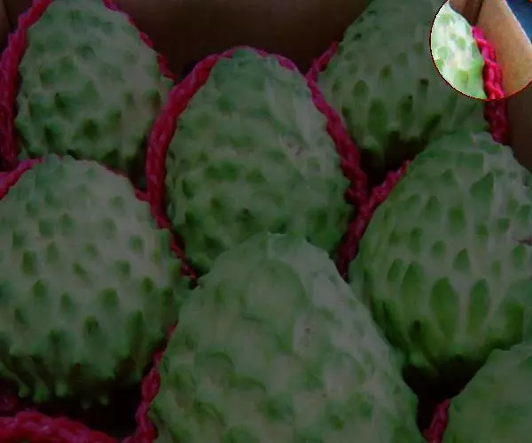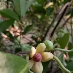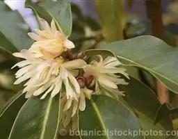 花单生于叶腋,雌雄异株,花被片白色或浅黄色,11-15片,外轮和内轮的较小,中轮的最大1片,椭圆形至倒卵形,长8-16毫米,宽5-12毫米;雄花:花托椭圆体形,顶端伸长圆柱状,圆锥状凸出于雄蕊群外;雄蕊群椭圆体形,长6-7毫米,径约5毫米,具雄蕊50-65枚;雄蕊长0.8-1.8毫米;花丝与药隔连成近宽扁四方形,药隔顶端横长圆形,药室约与雄蕊等长,花丝极短;花梗长3-20毫米,具数枚小苞片。雌花:雌蕊群近球形,径6-8毫米,具雌蕊30-55枚,子房长圆状倒卵圆形,花柱顶端具盾状的柱头冠;花梗3-30毫米。