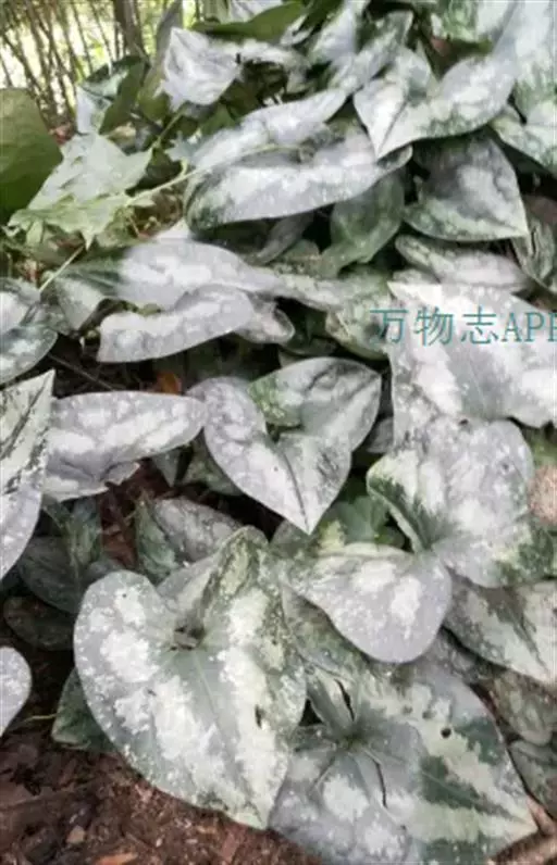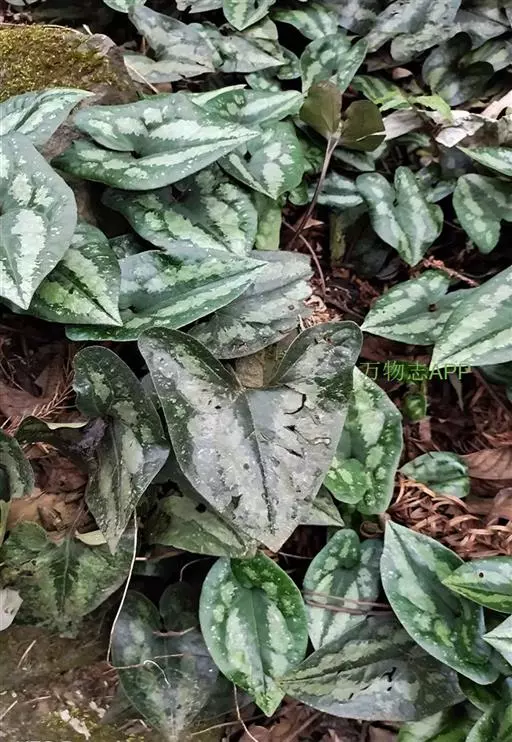 多年生草本;根状茎短,根丛生,稍肉质,直径1-2毫米。叶片阔心形至肾心形,长和宽各为3-8厘米,先端钝或圆,基部心形,两侧裂片长1-3厘米,宽1.5-3.5厘米,叶面深绿色,中脉两旁有白色云斑,脉上及其近边缘有短毛,叶背浅绿色;叶柄长3-15厘米;芽苞叶肾心形或倒卵形,长和宽各约1厘米,边缘有睫毛。