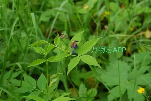 多年生草本,高40-100厘米。根膨大呈块状,近木质化,直径可达1-2厘米,表皮黑褐色或黄褐。茎具棱,通常数茎丛生,被微柔毛或近无毛。偶数羽状复叶长5-8厘米,叶轴顶端卷须短缩为短尖头;托叶半箭头形或斜卵形或长圆形,长0.8-1.2 (-1.6) 厘米,宽1-1.3厘米;全缘或基部齿蚀状。小叶通常 (2) 3 (-4) 对,长卵圆形或长卵圆披针形,长约3-8厘米,宽约1.3-3厘米;先端渐尖或长尾尖,基部圆或楔形;下面沿中脉被毛,全缘,纸质。总状花序腋生,于基部或总花序轴上部有2-3分支,呈复总状近圆锥花序,长约4-5厘米,通常短于叶;花萼斜钟状,萼齿三角形,仅长0.1厘米,比萼筒短5-6倍;花4-9朵,较稀疏,花冠蓝色,蓝紫色或玫瑰色,稀白色,旗瓣长圆形或长倒卵形,长1.1-1.4 (-1.8) 厘米,宽0.7-0.8厘米,先端圆微凹,中部缢缩,基部宽楔形,翼瓣与旗瓣近等长,瓣柄与瓣片近等长,龙骨瓣与冀瓣近等长;子房线形,花柱长约0.5厘米,上部四周有毛,胚珠5-6,柱头头状,子房柄长约0.1厘米。荚果长圆菱形,长2.5-5厘米,宽0.5-0.7厘米,两端渐尖,表皮黄色或干草色。种子1-4,椭圆形,直径约0.5厘米,种皮深褐色,种脐长相当于圆周的1/3或1/2。花期6-8月,果期7-9月。