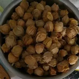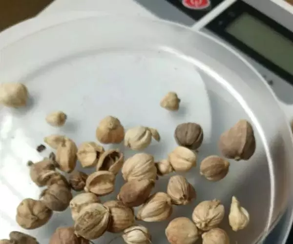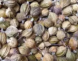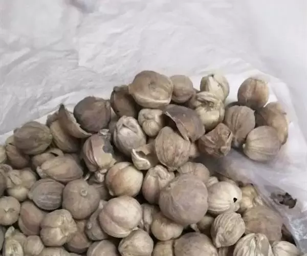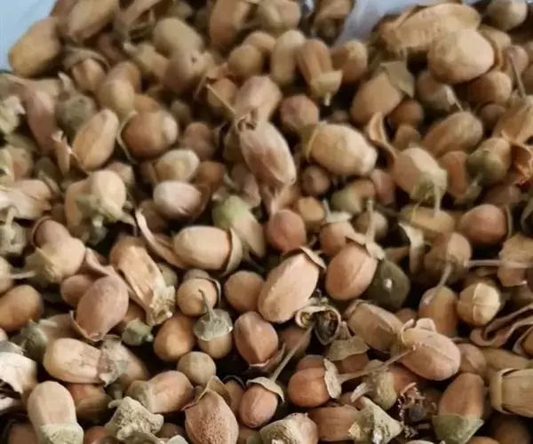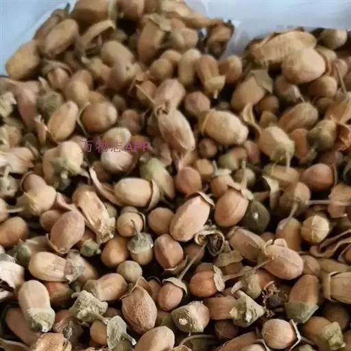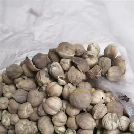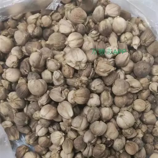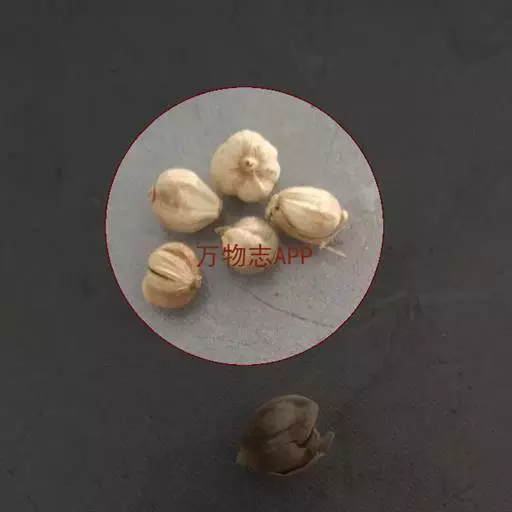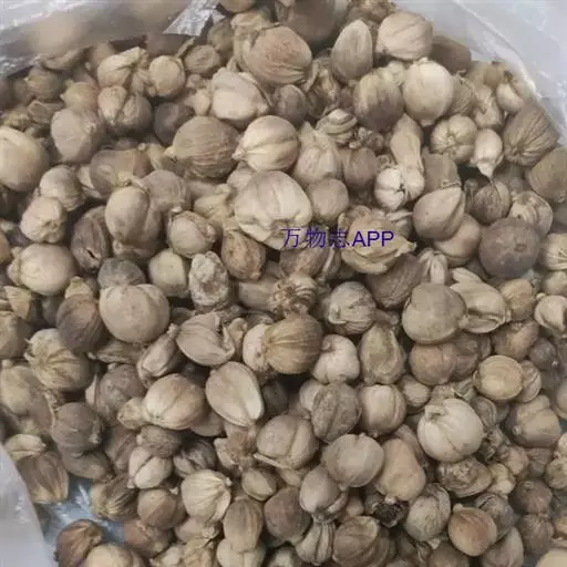 蒴果近球形,直径约16毫米,白色或淡黄色,略具钝三棱,有7-9条浅槽及若干略隆起的纵线条,顶端及基部有黄色粗毛,果皮木质,易开裂为三瓣;种子为不规则的多面体,直径约3-4毫米,暗棕色,种沟浅,有芳香味。花期:5月;果期:6-8月。