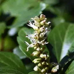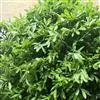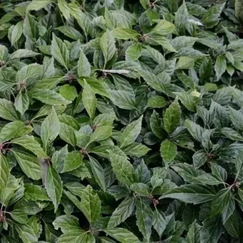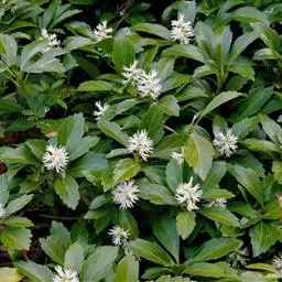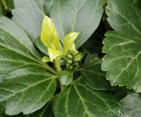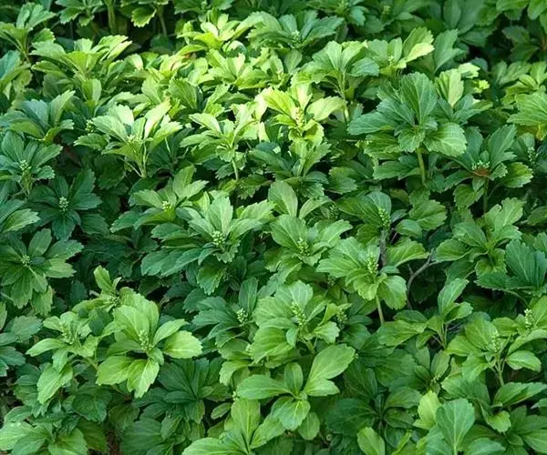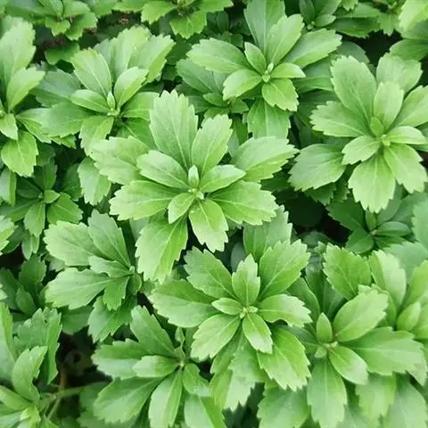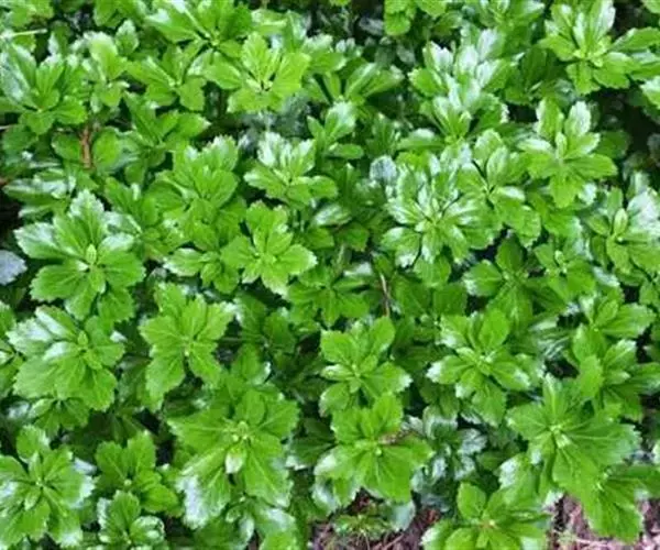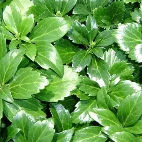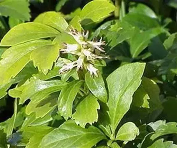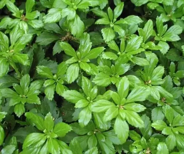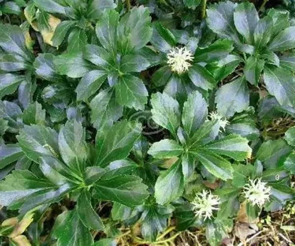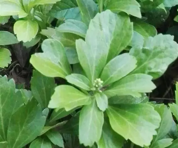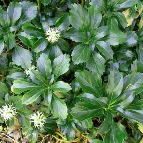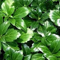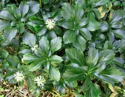 顶花板凳果(Pachysandra terminalis Sieb. et Zucc.)又名粉蕊黄杨和顶蕊三角咪,黄杨科顶花板凳属亚灌木,茎稍粗壮,下部根茎状,横卧,屈曲或斜上,叶薄革质,叶片菱状倒卵形,花序顶生,花白色,果卵形,花期4-5月。顶花板凳果性喜阴湿耐寒,自然生长在林下阴湿处,沟谷林下湿处,多生于山谷溪边、杂木林下、海拔1350~2200 m的山谷沟边或林中较阴湿处,产甘肃、陕西、四州、湖北、浙江等省,日本也有分布。顶花板凳果四季常绿,耐阴,易成活,粗放管理,是较好的阴生地被植物。顶花板凳果有吸收室内有害气体的能力,是优良的室内盆栽观赏植物,常配置于遮荫较多的树下、假山变、游园小径旁、楼房拐角处等进行配景,或成片栽植作为观赏地被植物。