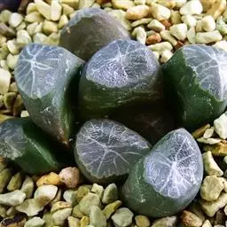 帝玉露是一款早期经典的品种,植株小窗晶莹剔透,叶片为翠绿色,叶尖有一根细长的纤毛,整个植株轻微往叶心合拢,叶片上的窗较小,叶片比姬玉露要大,常年翠绿色,晒厉害了会出现红褐色,休眠期为蓝绿色。