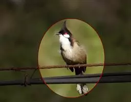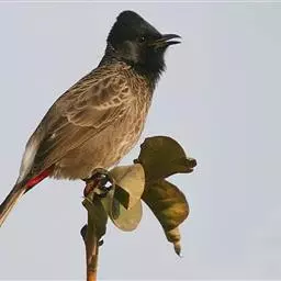 黄臀鹎(学名:Pycnonotus xanthorrhous):外形大小与红耳鹎相似,体长17-21厘米。额至头顶黑色,无羽冠或微具短而不明的羽冠。下嘴基部两侧各有一小红斑,耳羽灰褐或棕褐色,上体土褐色或褐色。颏、喉白色,其余下体近白色,胸具灰褐色横带,尾下覆羽鲜黄色。