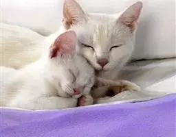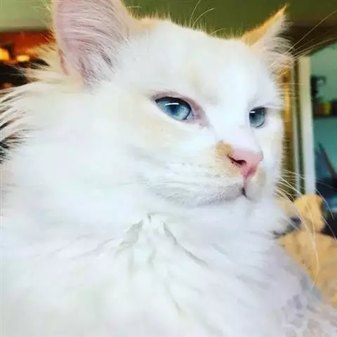 纯白色:闪闪发亮的纯白色。鼻头和足垫:粉红色;眼睛颜色:深蓝色或者红铜色.;金银眼则一眼为蓝色,一眼为红铜色,有同样深的色度。