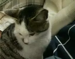 拼凑虎斑和白色(古典纹、鱼骨纹、斑点纹)PATCHED TABBY & WHITE (classic,mackerel and spotted): 白色带有彩色色块,彩色色块的标准遵循通行的拼凑虎斑色的标准。