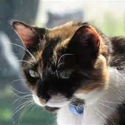 三色CALICO: 白色带黑色和红色的斑块。猫的足、腿、身体下侧面和鼻口是白色的话更好。如果白色超过这个范围给予相称的扣分。脸上由鲜明毛色形成反转的“V”字。眼色:艳丽的红铜色、蓝色或者金银眼。金银眼则一眼为蓝色一眼为红铜色,并且有同样深的色度。