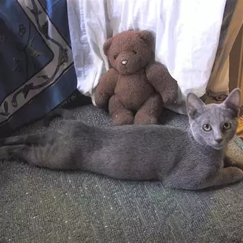 贝壳蓝色SHELL BLUE:下层绒毛白色,背部、肋部、头和尾巴的毛尖点缀着轻微的蓝色。肚子和胸膛白色。鼻头、眼睛外轮廓和足垫:蓝色。眼色:艳丽的红铜色。