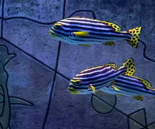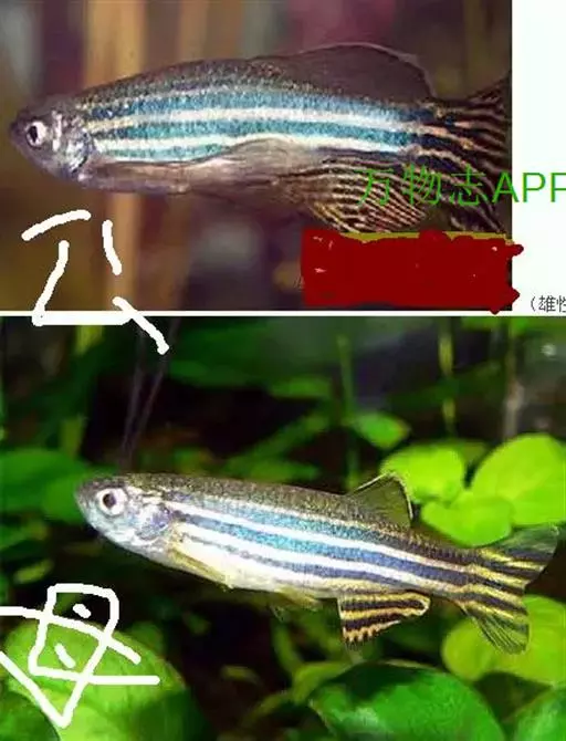斑马鱼 雄性体型细长,颜色略深,条纹较为显著,为深蓝色条纹间柠檬色条纹;雌鱼身体肥胖,颜色稍淡,为蓝色条纹间银灰色条纹,在性成熟后腹部肥大。