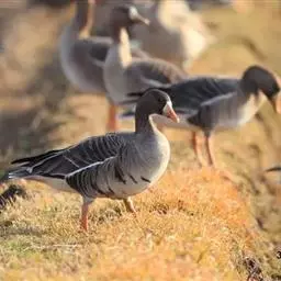 豆雁,雁形目鸭科。成鸟头、颈、背灰褐色,带淡黄色羽缘;尾上覆羽白色,尾羽黑褐色带白端,…