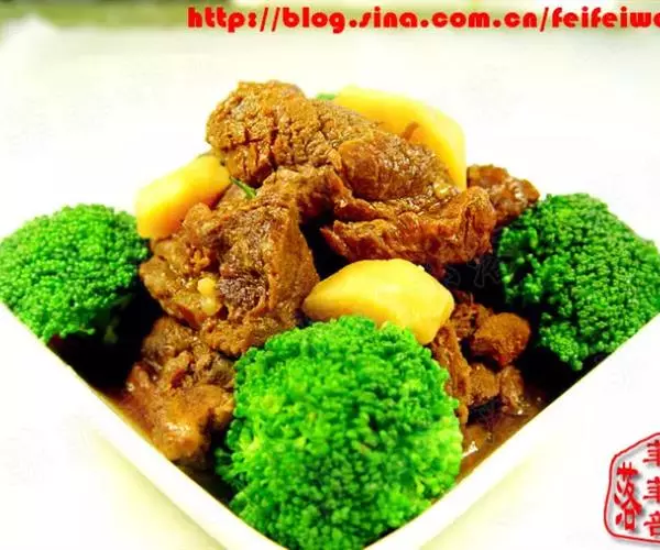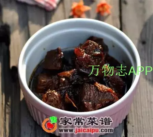 红烧牛肉 牛肉75克, 豆瓣酱10克,白萝卜30克,花椒1?5克,盐2克,花 生油10克,白糖、八角各适量。