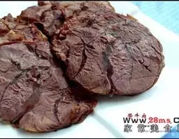 1.选用带筋缠的黄牛肉(肋条更好),先用清水洗净,切成小块(1000克切成50块)。用盆盛装 ,加入清水1500克,浸泡20分钟,倒入一个铝锅内,煮至刚沸,拣净血沫,否则成菜不清爽。