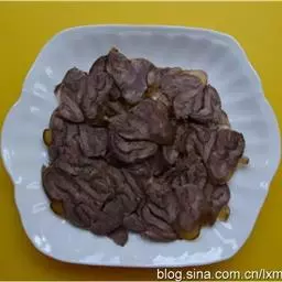2、锅中倒1杯 油烧热,放入牛肉片小火炸至肉片干酥,捞出。